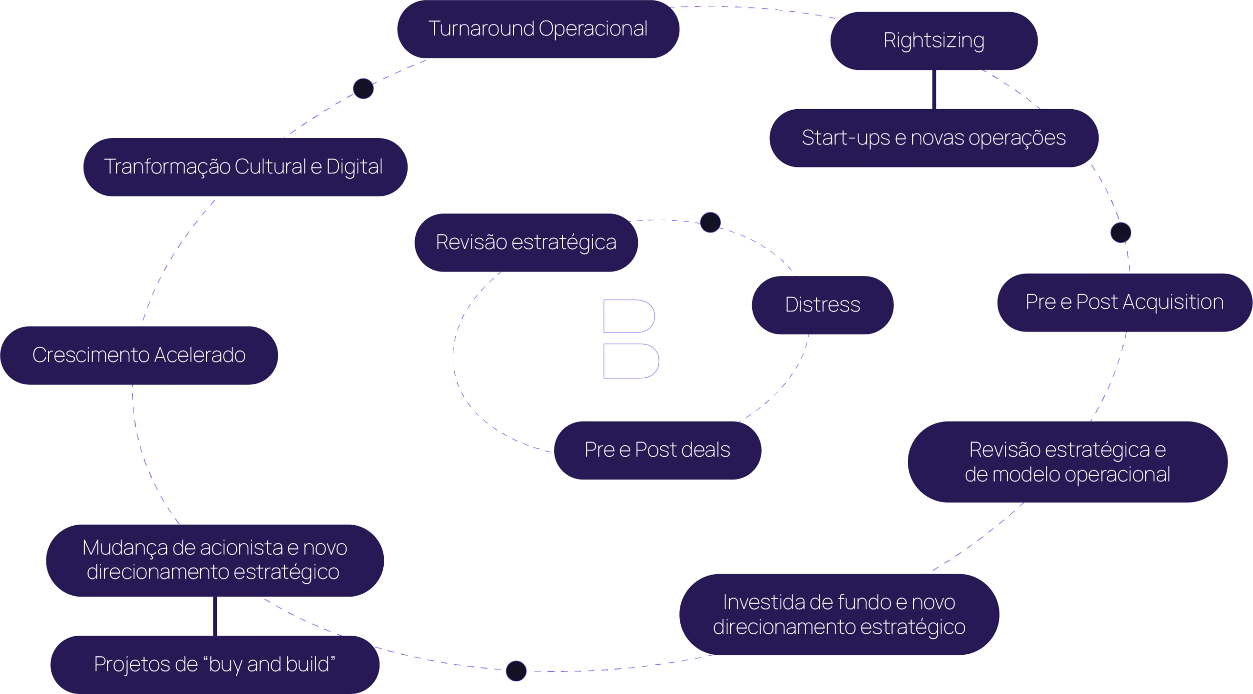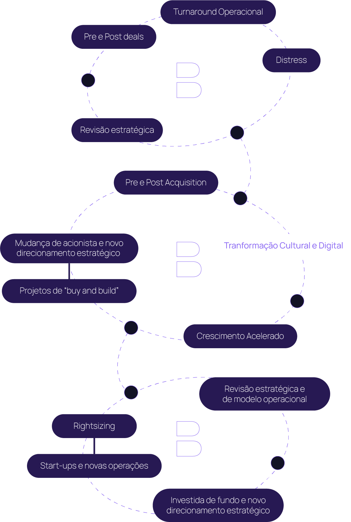 Desde o momento da diligencia de potenciais adquiridas, suportando a avaliação estratégica das teses, na avaliação da liderança, além da definição da estruturas e time ideal para cada tese.